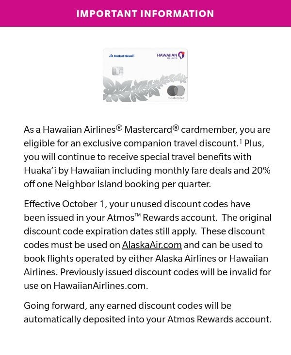 I just received this email from Hawaiian Airlines: As a Hawaiian Airlines Mastercard member, you are eligible for an exclusive companion travel discount. Effective October 1, your unused discount codes have been issued in your Atmos Rewards account. The original discount expiration dates still apply. These discount codes must be used on AlaskaAir.com and can be used to book flights operated by either Alaska Airlines or Hawaiian Airlines. Previouslly issued discount code will be invalid for use on Hawaiian Airlines.com. Going forward, any earned discount codes will be automatically deposited into your Atmos Rewards account.