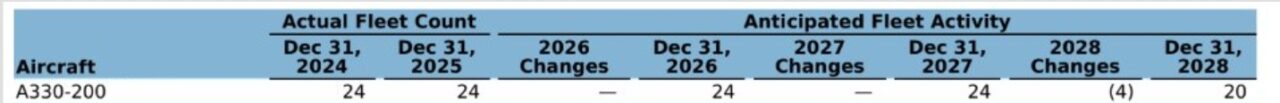 We pulled the Hawaiian (Alaska) 10-K filing from February 12 and went straight to the Hawaiian fleet schedule showing exactly how many aircraft the company plans to operate, acquire, and retire in the years ahead. When you look forward two years to 2028, the widebody picture starts changing.
