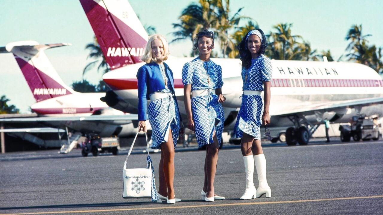 Flight attendants welcomed passengers with leis, ukuleles, and island warmth. These tailored jackets gave way to pillbox hats, and eventually to bold prints that matched the mood of the changing times.