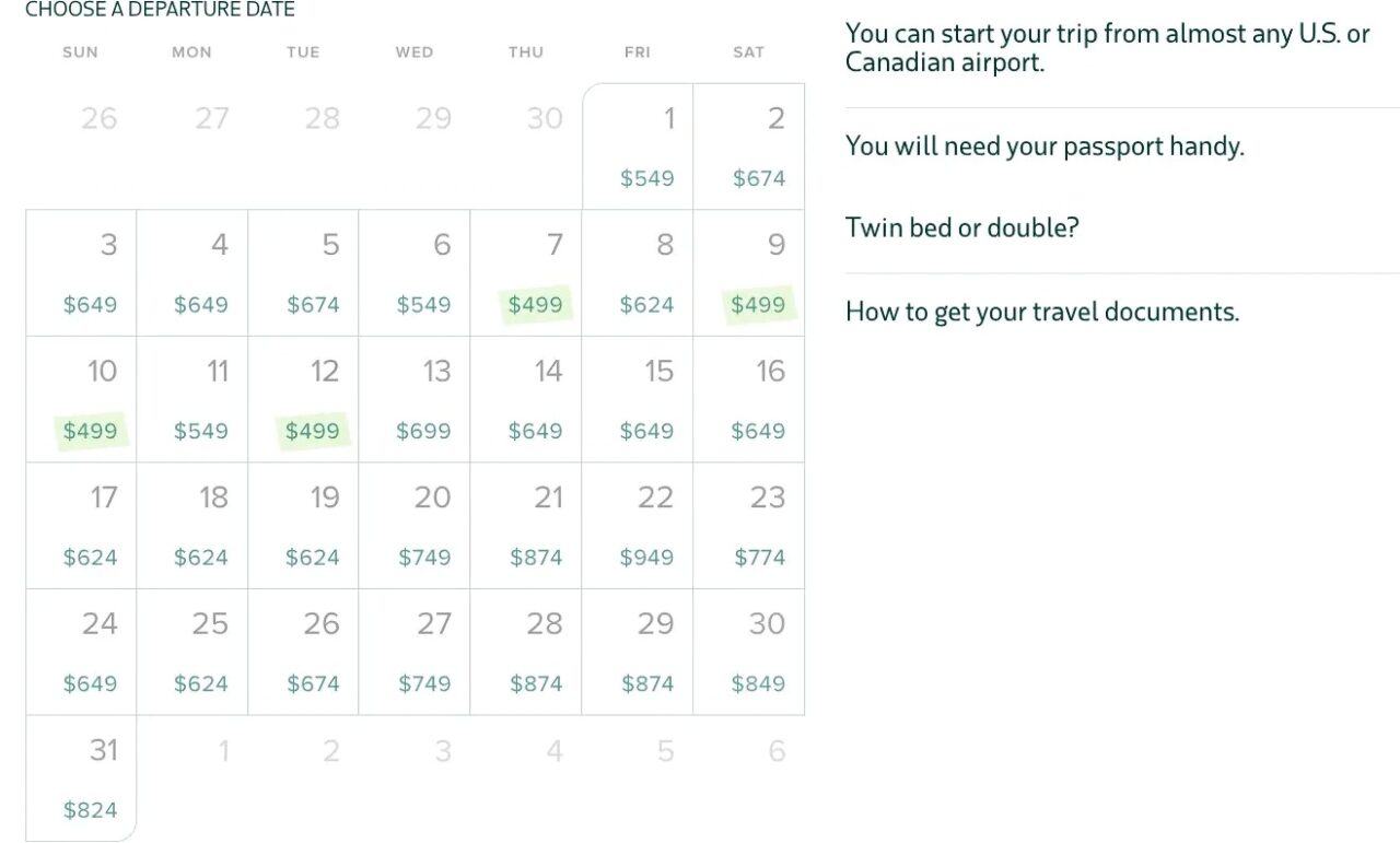 Most of the calendar sits well above the advertised price, often by hundreds of dollars. The $499 figure is the rare exception, not the norm, and even that is $100 higher than what Travelzoo is advertising to get people to put up their credit card to enter behind the door.
