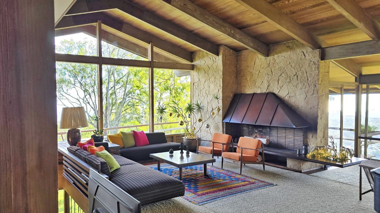 The Liljestrand House is celebrated for using natural materials like redwood siding and wood-paneled interiors. Floor-to-ceiling windows frame breathtaking views of Honolulu, Diamond Head, and the Pacific Ocean, while shoji screens add a touch of Japanese elegance and functionality.